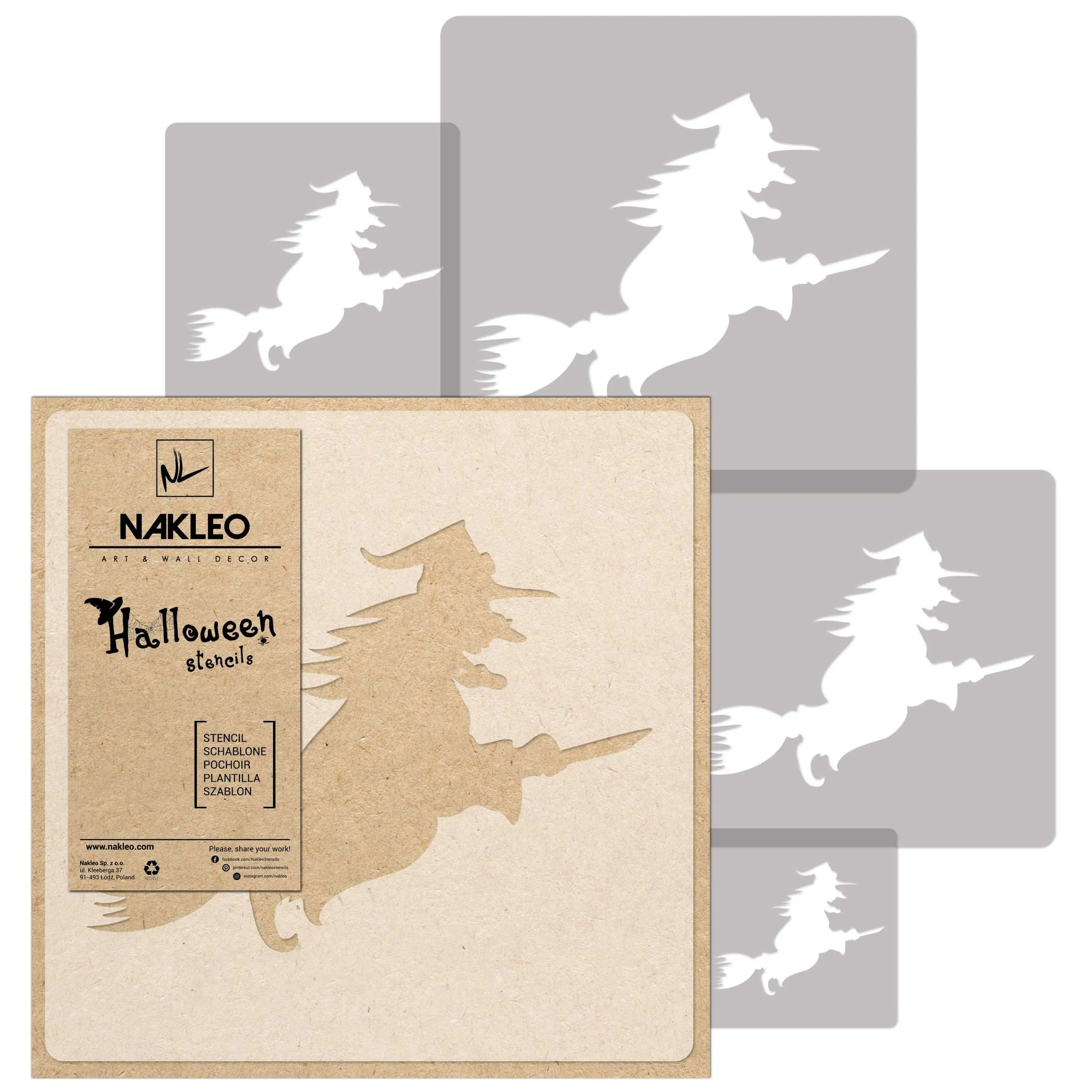 Séria halloweenskych šablón Nakleo obsahuje odolné plastové šablóny na vytváranie jedinečných halloweenskych dekorácií.
