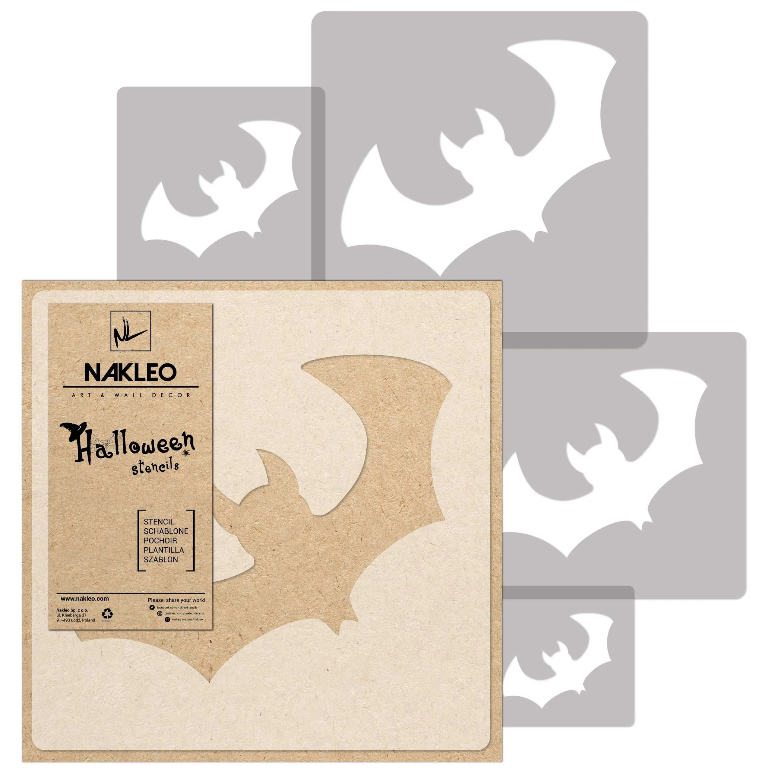 Séria halloweenskych šablón Nakleo obsahuje odolné plastové šablóny na vytváranie jedinečných halloweenskych dekorácií.