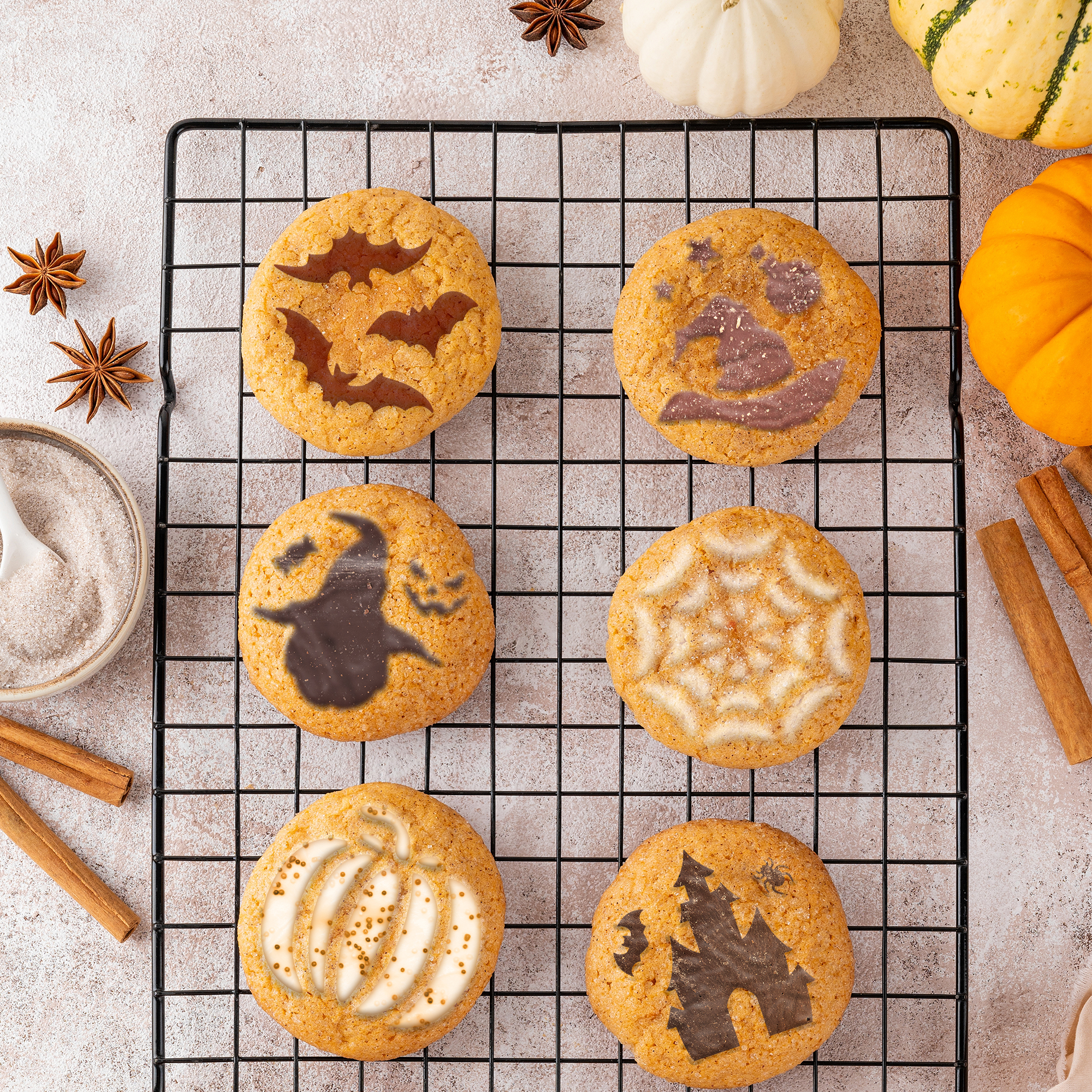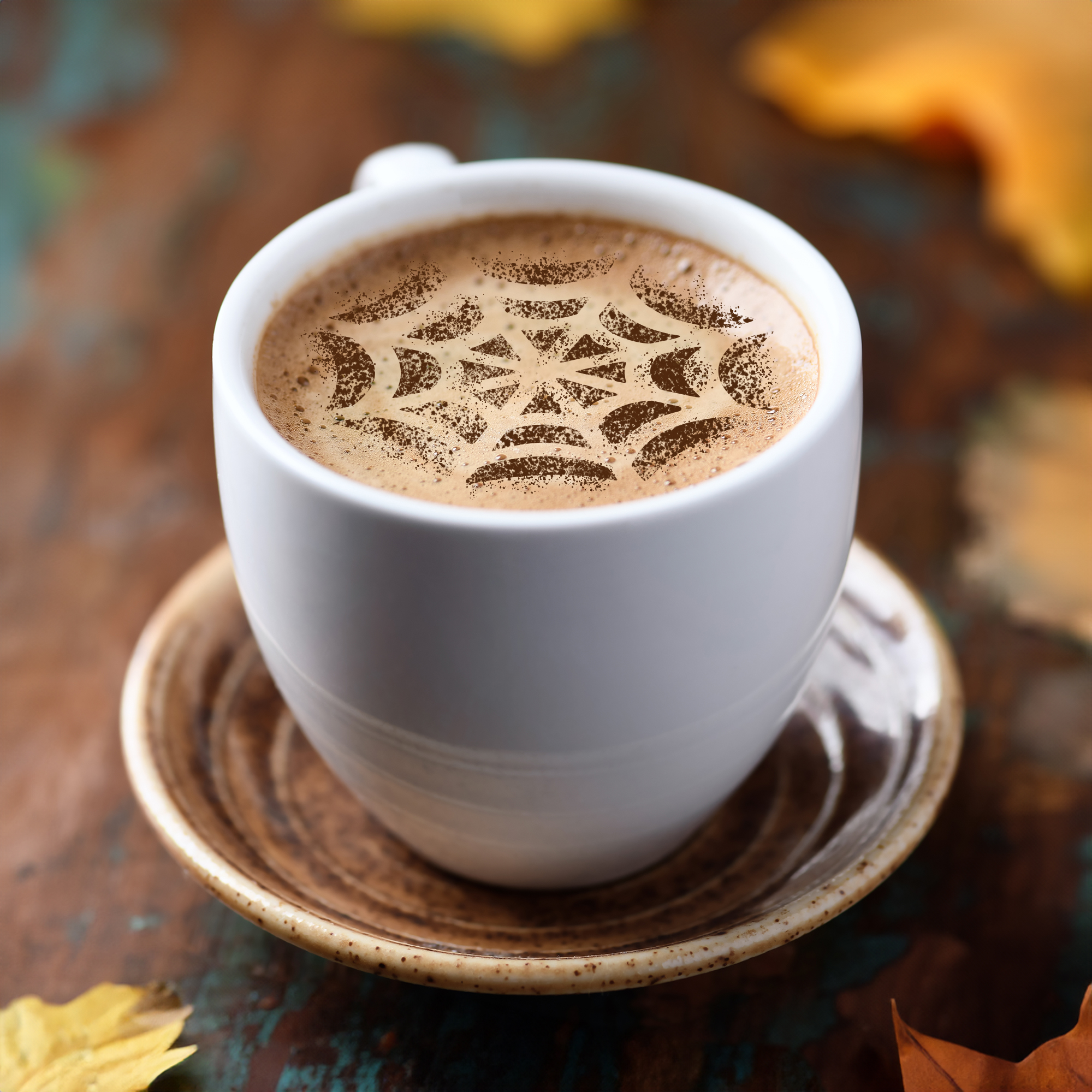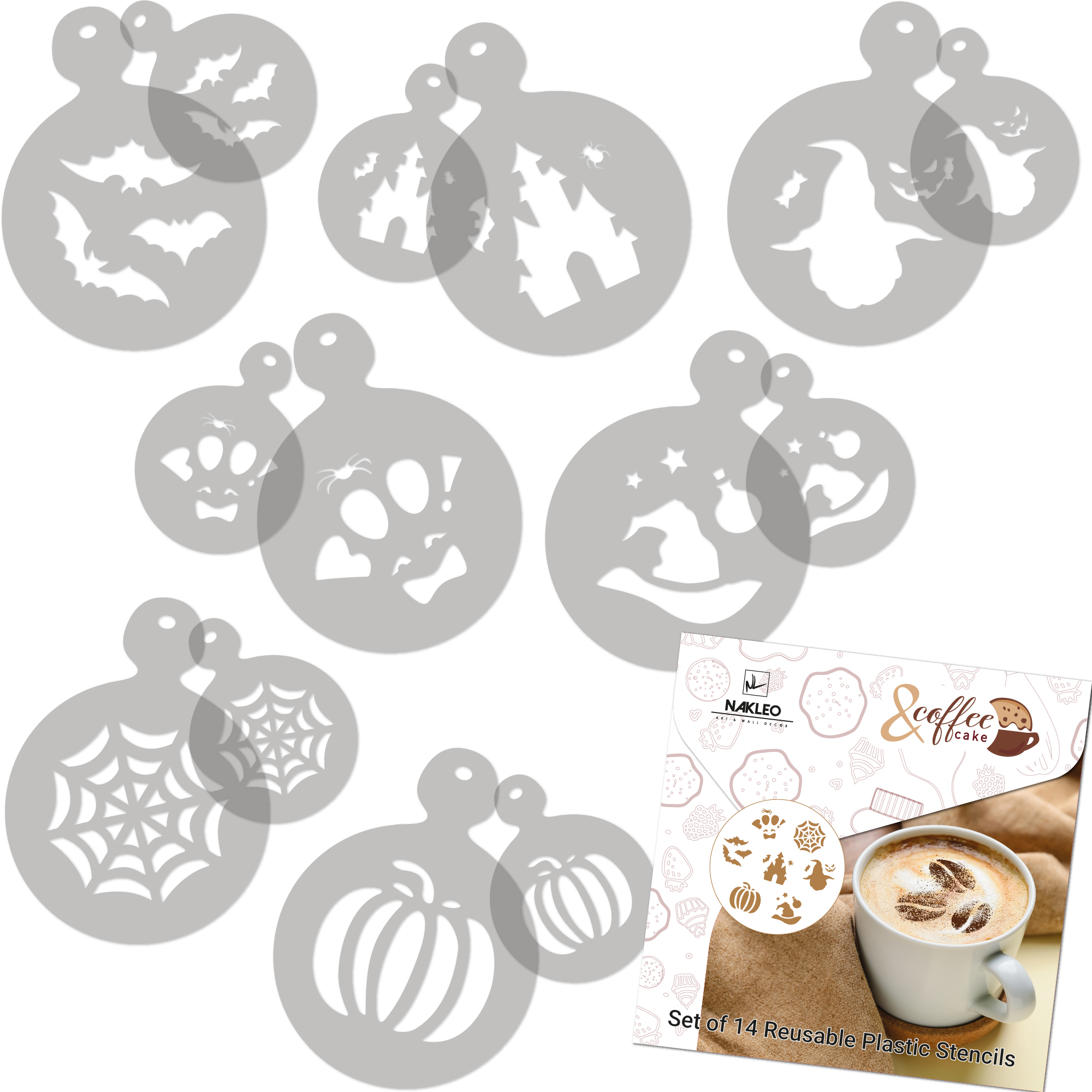 Tieto šablóny dodajú každému koláčiku alebo káve, ktorú si pripravíte, s motívmi ako tekvice, čarodejnícke klobúky, tekvice, duchovia, pavúky, netopiere a pavučiny, temný halloweenský nádych.