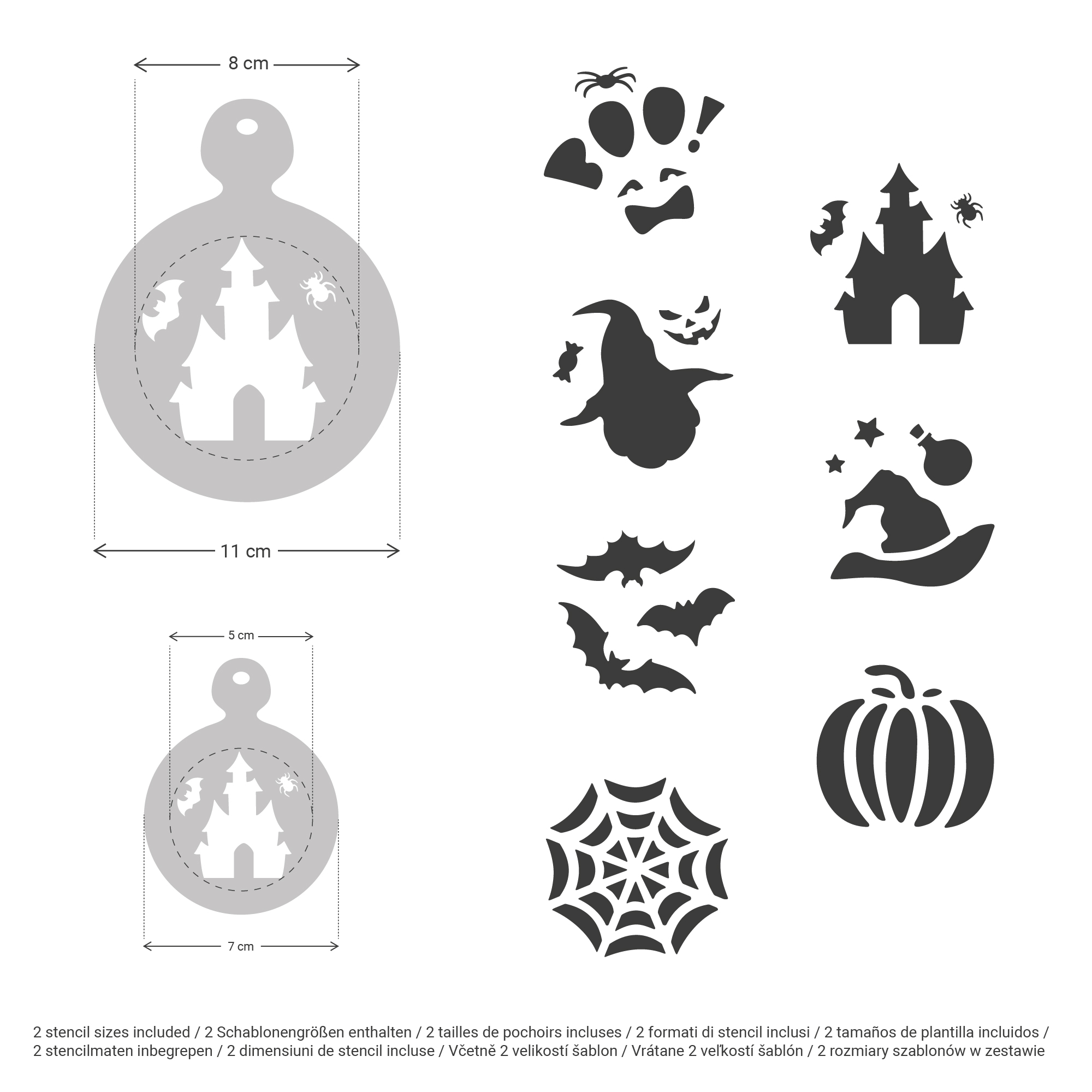 Šablóny na zdobenie halloweenskej kávy a koláčikov sú sada  inšpirovaná slávnou tradíciou koledovania. Určené pre tých, ktorí milujú kostýmy, vyrezávanie tekvíc, sladkosti a strašidelné dekorácie!