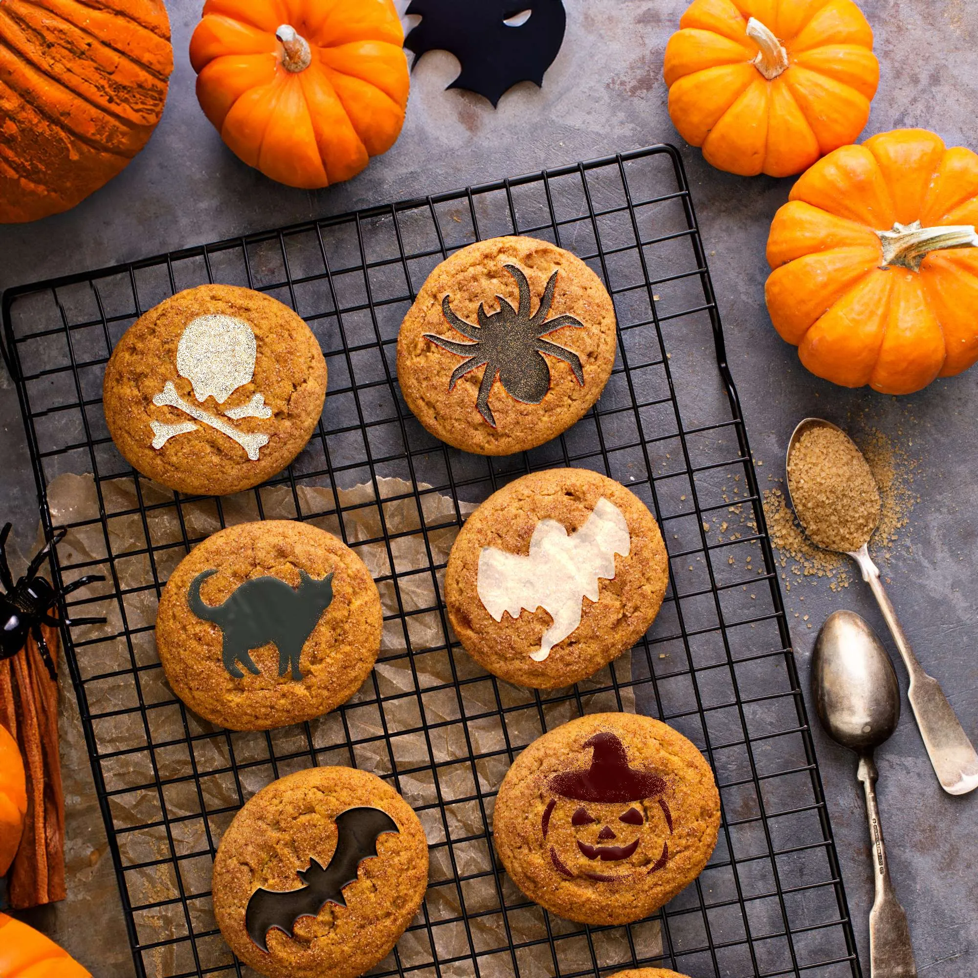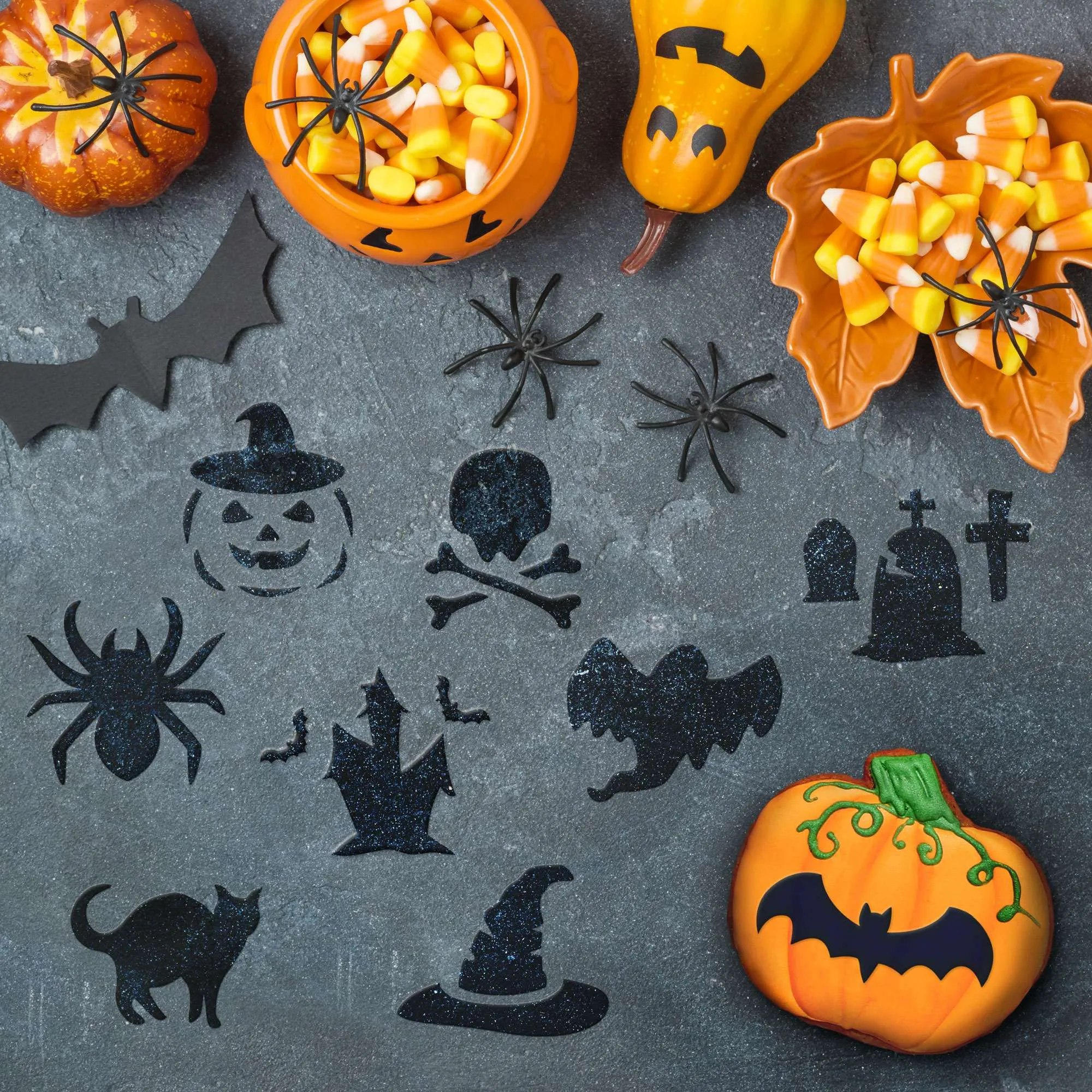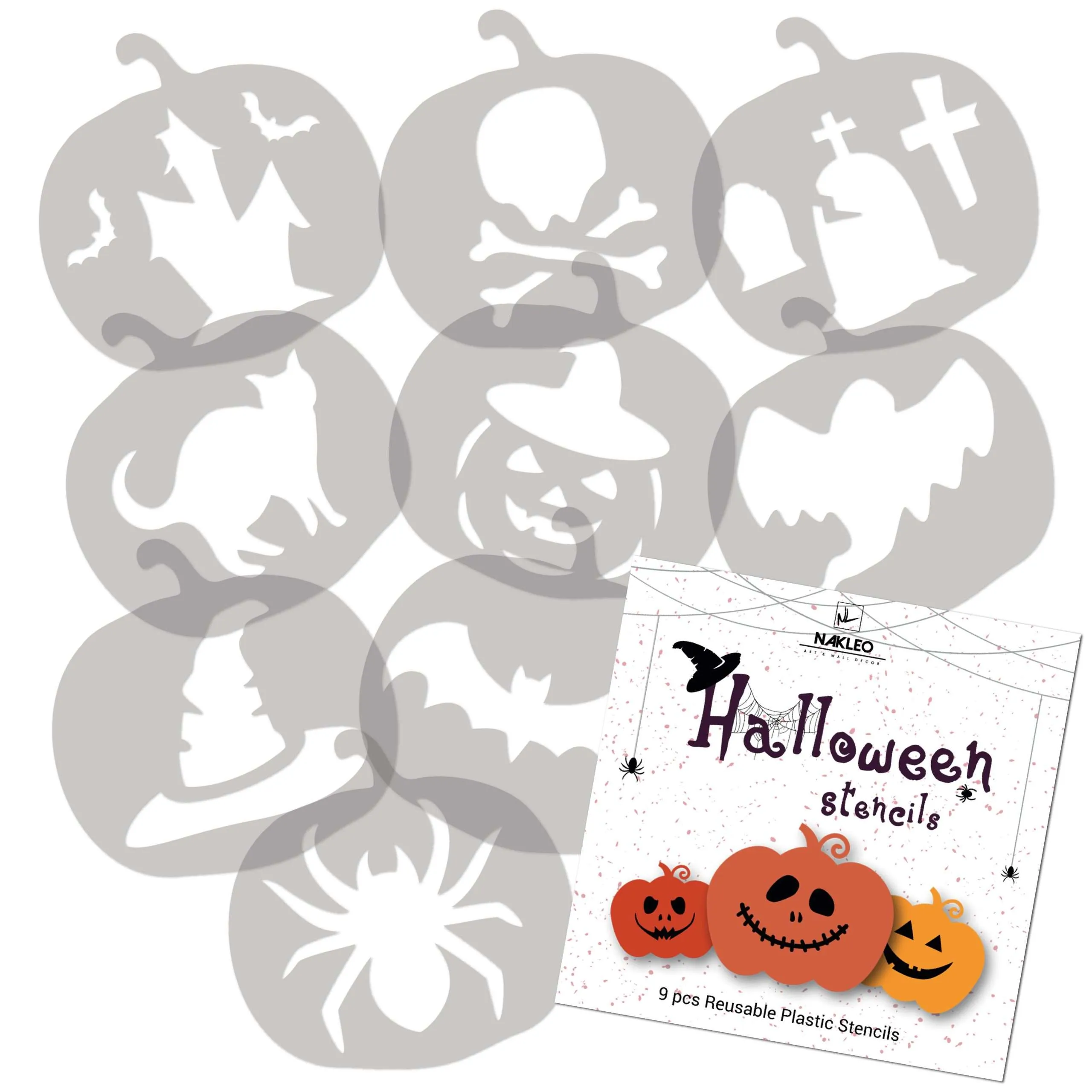 éria halloweenskych šablón Nakleo obsahuje odolné plastové šablóny na vytváranie jedinečných halloweenskych dekorácií.